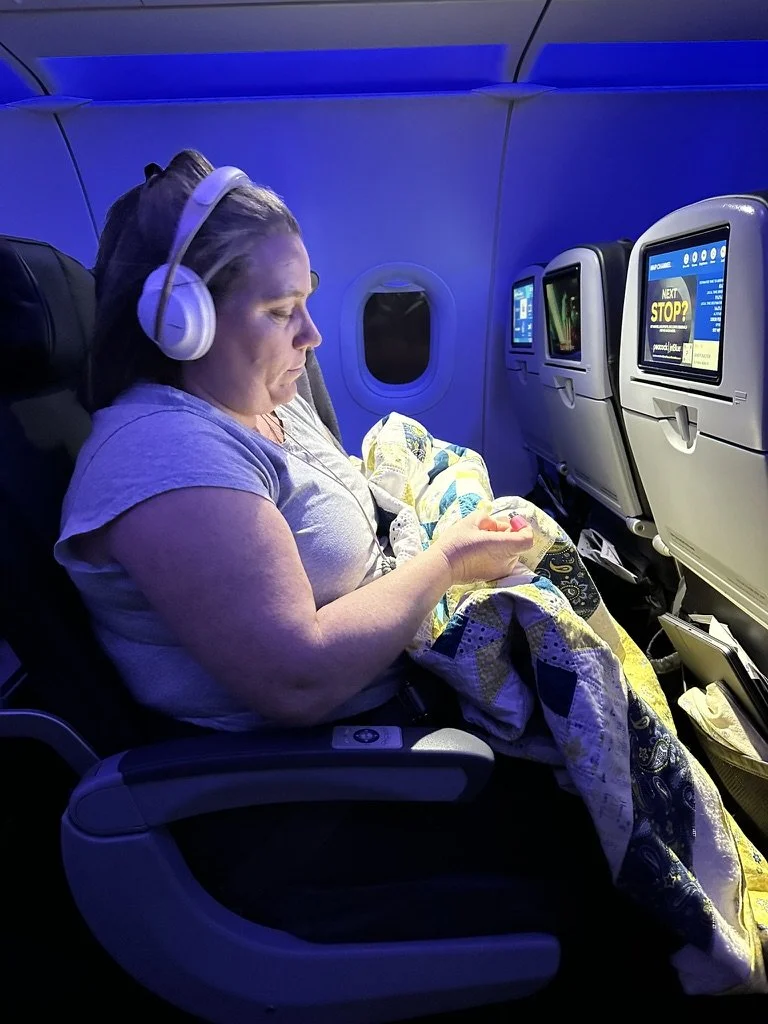 Tip: If you’re going to quilt a “larger” quilt on an airplane (this one is a large throw size), then it would be best to make sure you know the person you’re sitting next to. When we flew back from our New England trip, I was sitting next to my son, so I could get away with flipping my quilt across his lap again and again.