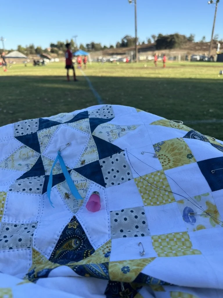 Bringing my hand quilting out into the world is more than just staying warm and making progress on my stitching. I’m not just occupying my time; I’m also adding to the story and the life of that quilt. Max’s Monkey quilt was there with me at the pool in Fallbrook as his older brother got new best times in his swim meet and grew as a competitive swimmer. My cousin’s wedding quilt was there with me as I sat in the dance studio’s hallways, just outside of the classroom where my middle son fell in love with the art of tap dancing. My husband’s quilt has kept me warm, and helps keep the mosquitos off my legs, while I sit out in the elements watching our youngest son ignite his passion for soccer. And of course, there’s my Mystery Quilt that helped me survive our time in the NICU.